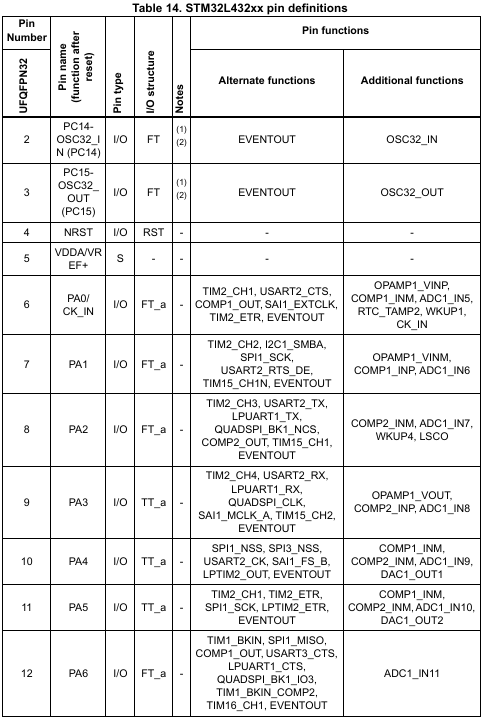 Power Train 분석까지 끝났으니, 이제 Pin map을 작성할 차례이다. stm32l432kcu6은 아래의 사진과 같이 총 32개의 핀이 있다.